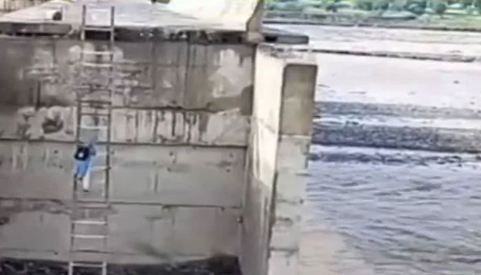 شمالی وزیرستان: سیلاب سے رابطہ پل کا راستہ ٹوٹنے کے باعث شہری سیڑھی کے ذریعے دریا پار کرنے پر مجبور