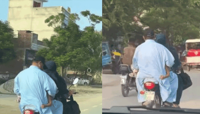 موٹر سائیکل چلاتی خاتون اور بچہ سنبھال کر پیچھے بیٹھے مرد کی ویڈیو وائرل