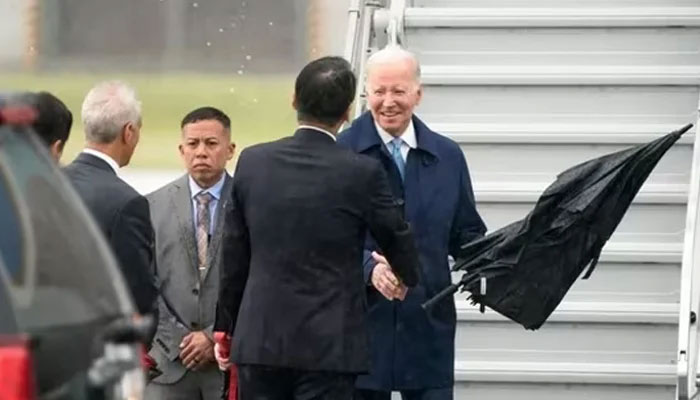 امریکی صدر جوبائیڈن سے بارش کے دوران چھتری نہ کُھل سکی