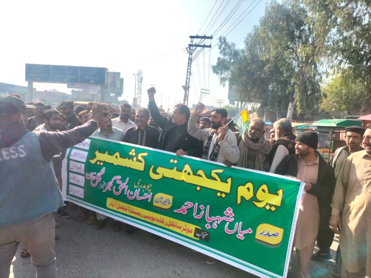 فیصل آباد (معظم رندھاوا) ملک بھر کی طرح فیصل آباد میں بھی کشمیری بھائیوں کیساتھ یکجہتی کے لیے ریلیاں نکالی گئیں ۔تفصیلات کے مطابق فیصل آباد جنرل بس سٹینڈ میں یوم یکجہتی کشمیر کی ریلی نکلی گی جس میں چوہدری ثناءاللہ ہنجرا سیکرٹری ڈی آر ٹی اے میاں شہباز احمد صدر ورکرز فیڈریشن و دیگر نے حصہ لیا ۔پاکستان زندہ باد کمشنر لیکر رہیں گے کمشنر ہمارا ہے،کشمیر پاکستان کی شہ رگ ہے کے نعروں سے بس سٹینڈ گونج اٹھا ۔سفر کرنے والے مسافروں نے بھی مل کر نعرے لگاتے رہے ۔سیکرٹری نے کہا کہ ہمارے بزرگوں نے قربانی دے کر ہمیں خوبصورت پاکستان دیا اس وقت ہی جموں کشمیر کو قصبوں نے سازش کے تحت قبضہ کر لیا ،انشاء اللہ ایک دن سارا کشمیرپاکستان کا ہو گا، آج کے دن تمام بس سٹینڈ کے لوگوں کو کہتا ہوں کہ وہ جنرل بس سٹینڈ بھی پاکستان کا حصہ ہے اس کی صفائی کا خیال رکھیں ۔میاں شہباز احمد نے سیکرٹری کا اور تمام شرکاء کا شکریہ ادا کیا علاوہ ازیں جماعت اسلامی کی جانب سے کشمیری بھایوں سے اظہار یکجہتی کے لیے ریلی نکالی گئی جس میں جماعت اسلامی کی مقامی قیادت کے علاوہ سول سوسائٹی کے افراد نے بھی شرکت کی۔
