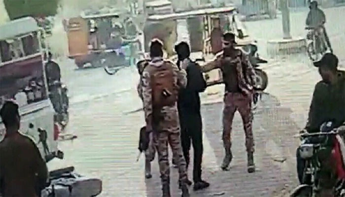 موٹر سائیکل سوار نے رینجرز میں سے ایک کی طرف ہاتھ بڑھایا لیکن ایک اہلکار نے اسے کالر سے پکڑ لیا اور دو اہلکاروں نے اسے مارنا شروع کردیا۔