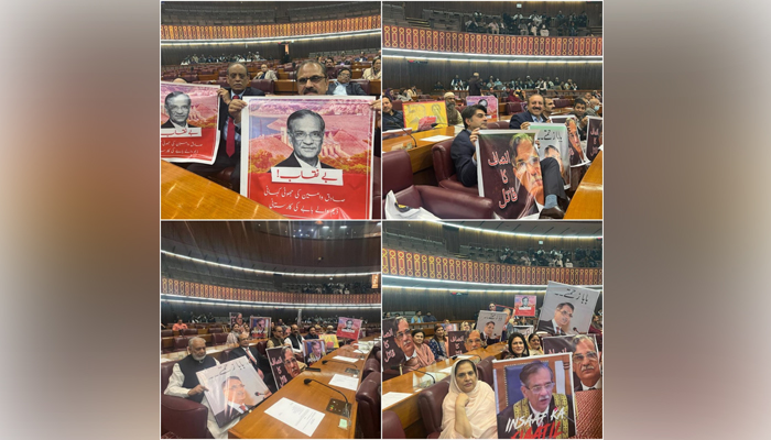 حکومتی اراکین نے ثاقب نثار مخالف پلے کارڈز اٹھائے ہوئے ہیں جن پر سابق چیف جسٹس ثاقب نثار کے خلاف نعرے درج ہیں۔