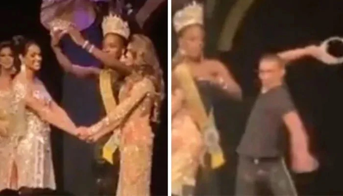برازیل میں ایک مقابلہ حسن کے دوران بیوی کا دوسرا نمبر آنے پر ماڈل کے شوہر غصے میں آکر اسٹیج پر پہنچ گئے مقابلے کی فاتح کا تاج چھین کر اسٹیج پر ہی توڑ دیا۔
