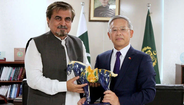 چین کے سفارت کار نے تحفے میں چینی گھوڑے کا ایک قیمتی سیرامک مجسمہ دیا ہے۔