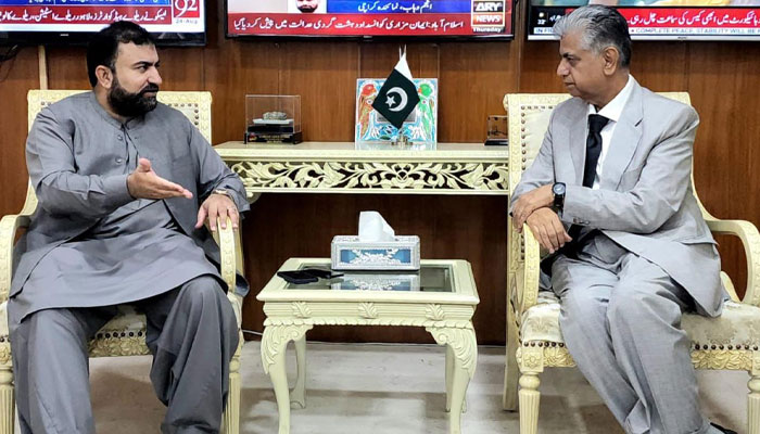 وزارت داخلہ پہنچنے پر نگران وزیر داخلہ سرفراز بگٹی نے نگران وزیر اطلاعات مرتضی سولنگی کا خیر مقدم کیا۔