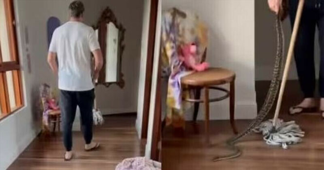 ویڈیو کلپ میں میک گراموپ کا استعمال کرتے ہوئے سانپ پکڑنے کی کوشش کررہے ہیں، اس دوران پس منظر سے ان کی اہلیہ کی چیخوں کی آواز سُنائی دیتی ہے۔