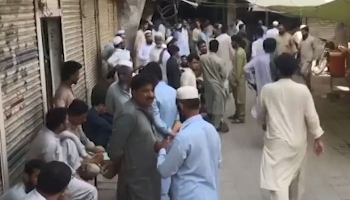 پشاور کی کرنسی مارکیٹ سیل ہو جانے کے بعد دکانوں کے باہر دکانداروں اور گاہکوں کے درمیان سودے بدستور جاری