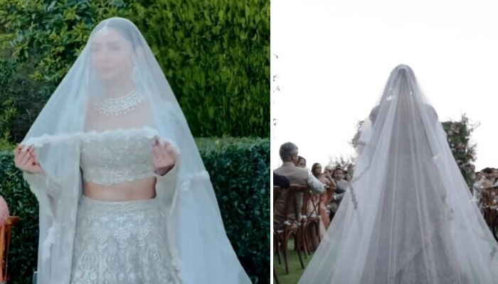وائرل ویڈیو میں اداکارہ کو اس خاص دن کیلئے سفید رنگ کے بھاری کامدار آئیوری لہنگے میں دیکھا جاسکتا ہے۔
