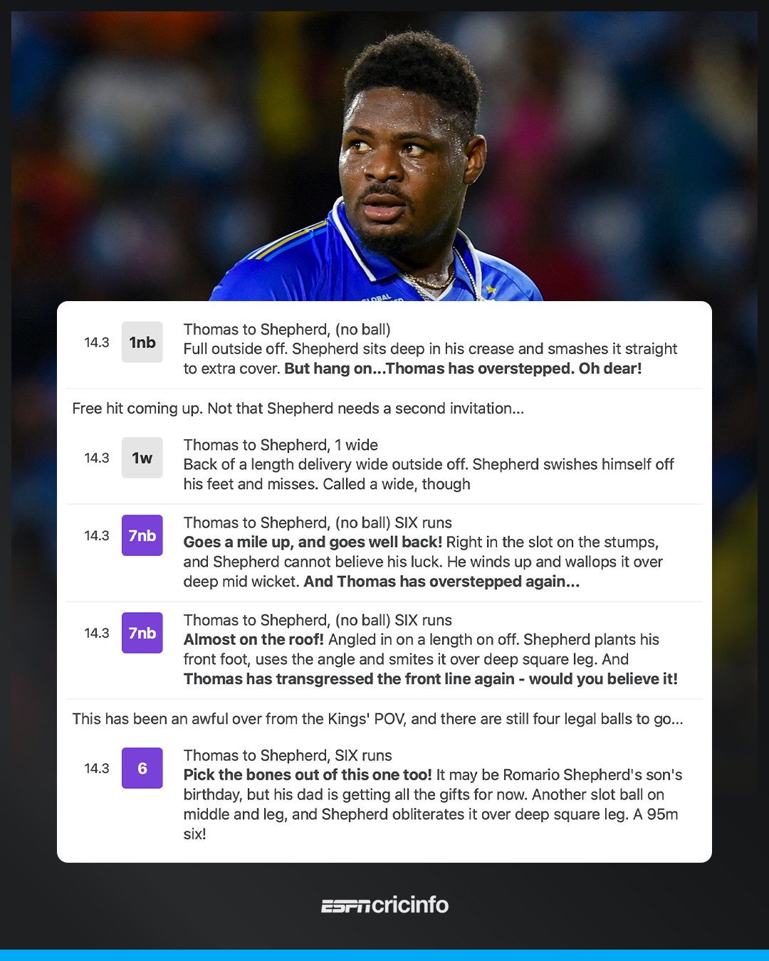 پندرہویں اوور میں بولر اوشانے تھامس کی جانب سے مسلسل نوبالز اور وائیڈ بالز کرائی گئیں۔ ایک موقع پر شیفرڈ کیچ آؤٹ ہوئے مگر گیند نوبال قرار پائی۔ فری ہٹ برقرار رہی اور اگلی دو نوبالز پر انہوں نے دو چھکے جڑ دیے۔ اس کے بعد لیگل گیند پر بھی چھکا مار دیا۔ یوں ایک قانونی گیند پر مجموعی طور پر 22 رنز بنے۔