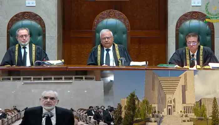 جسٹس امین الدین خان کی سربراہی میں قائم بینچ میں جسٹس مظاہر، جسٹس جمال خان مندوخیل، جسٹس عائشہ ملک، جسٹس سید حسن اظہر رضوی، جسٹس مسرت ہلالی، جسٹس نعیم اختر افغان اور جسٹس شاہد بلال حسن شامل ہیں۔