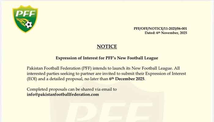 اسلام آباد (سپورٹس رپورٹر)پاکستان فٹبال فیڈریشن (PFF) نے ملک میں نئی فٹبال لیگ کے آغاز کا اعلان کر دیا ہے۔ فیڈریشن کی جانب سے جاری کردہ نوٹس کے مطابق اس مقصد کے لیے دلچسپی رکھنے والی تنظیموں، اداروں اور سرمایہ کاروں سے Expression of Interest (EOI) اور تفصیلی تجاویز طلب کر لی گئی ہیں۔نوٹس میں کہا گیا ہے کہ تمام دلچسپی رکھنے والے فریقین اپنی تجاویز 6 دسمبر 2025 تک جمع کروا سکتے ہیں۔ مکمل تجاویز ای میل کے ذریعے [email protected] پر ارسال کی جا سکیں گی۔پاکستان فٹبال فیڈریشن کے مطابق نئی لیگ کا مقصد ملک میں فٹبال کے فروغ، کھلاڑیوں کو بہتر مواقع فراہم کرنے اور کھیل کے معیار کو عالمی سطح کے مطابق بہتر بنانا ہے۔
