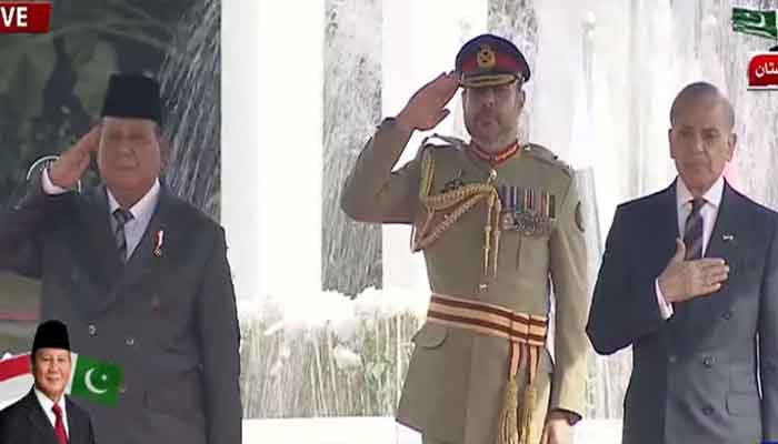 وزیراعظم شہباز شریف نے معزز مہمان کا پرتپاک استقبال کیا، دونوں رہنماؤں نے گرمجوشی کے ساتھ مصافحہ کیا، برادر اسلامی ممالک انڈونیشیا کے صدر ابووسو بیانتو کو مسلح افواج کے چاق و چوبند دستے نے گارڈ آف آنر پیش کیا۔