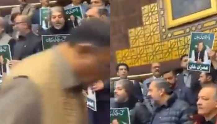 اس دوران پی ٹی آئی اراکین ایوان میں پہنچ گئے، اراکین نے بانی پی ٹی آئی کی تصاویر اٹھا کر احتجاج کیا، اپوزیشن اراکین نے ایوان میں نعرے بازی کی۔