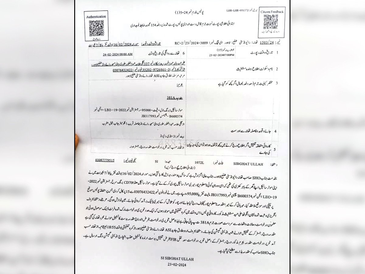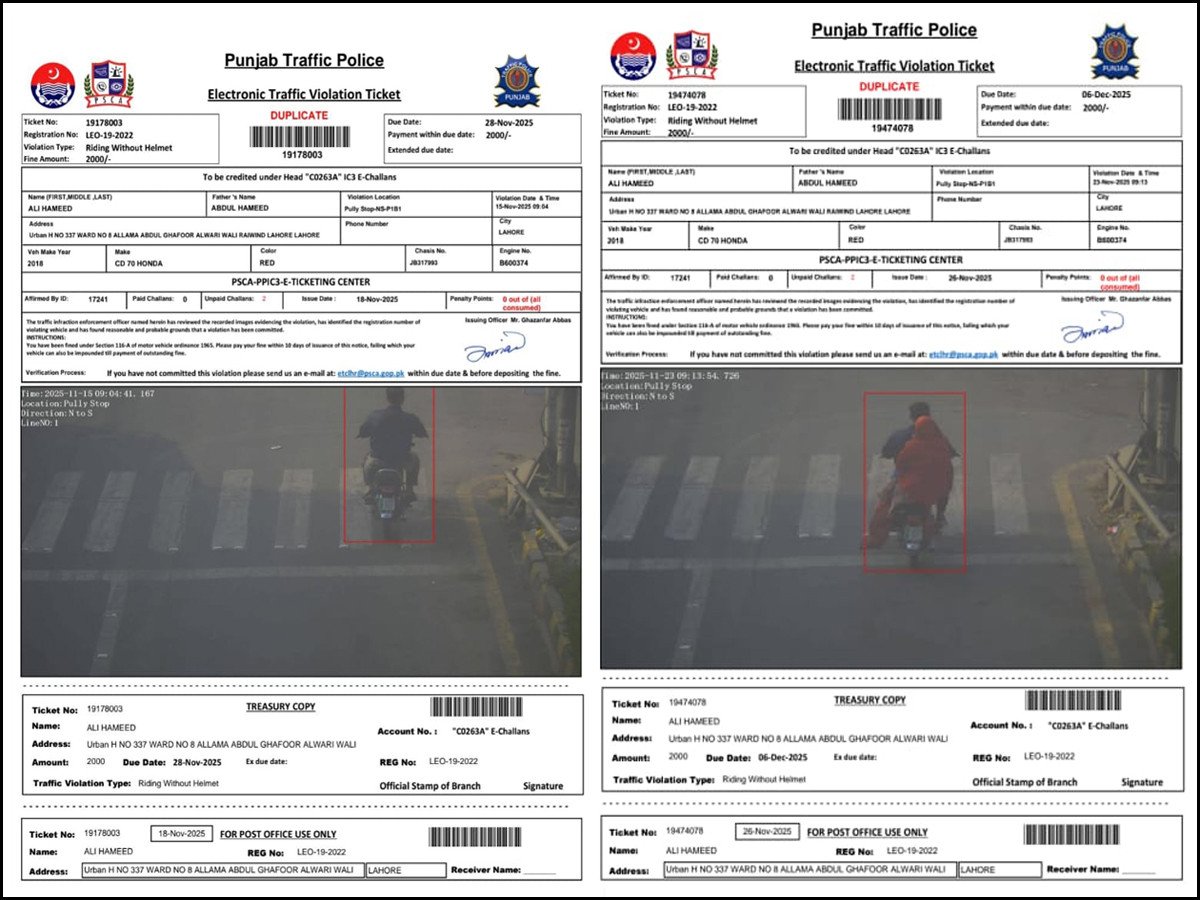 واضح رہے کہ شہری کی موٹر سائیکل 2024ء میں چوری ہوئی تھی، جس پر شہری کی جانب سے تھانہ رائیونڈ میں فروری 2024ء میں مقدمہ درج کروایا گیا تھا، تاہم پولیس میں مقدمے کے باوجود شہری کو گزشتہ روز اپنی چوری شدہ موٹر سائیکل کا دوسرا ای چالان بھی موصول ہوگیا۔