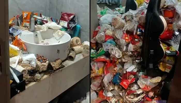 وائرل ہونے والی ویڈیو میں دیکھا جا سکتا ہے کہ کمرے کے ہر کونے میں کھانے کے گندے ریپر، مشروبات کی خالی بوتلیں اور کچھ کھانے سے بھرے برتن بھرے ہوئے ہیں اور اس ڈھیر کی اونچائی تقریباً تین فٹ تھی۔