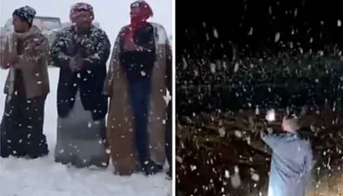 سعودی عرب میں ریت کے وسیع و عریض ٹیلوں پر برف کی سفید چادر بچھ گئی، جس کی ویڈیوز سوشل میڈیا پر وائرل ہو رہی ہیں۔ ویڈیوز میں دیکھا جا سکتا ہے کہ شہری گرم جیکٹس پہنے برفباری کا لطف اٹھا رہے ہیں اور اللہ کا شکر ادا کر رہے ہیں۔