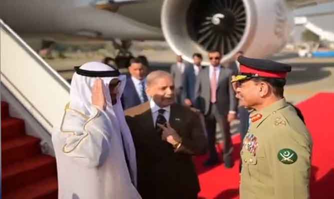 وزیراعظم شہباز شریف اور فیلڈ مارشل عاصم منیر نے کابینہ کے ہمراہ انہیں خوش آمدید کہا، وزرا میں اسحاق ڈار، خواجہ آصف، احسن اقبال،عطا تارڑ اور دیگر موجود تھے۔ وزیراعظم نے وزرا کا تعارف بھی کرایا۔ یو اے ای صدر کے ساتھ ان کا اعلیٰ سطح کا وفد بھی پہنچا۔