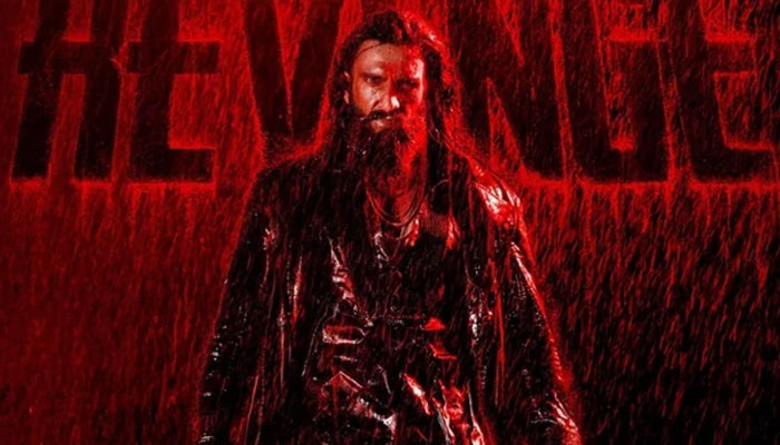 پوسٹر میں رنویر سنگھ بارش میں سرخ روشنی کے نیچے کھڑے دکھائی دیتے ہیں، جو خون کی بارش کا تاثر دیتی ہے۔