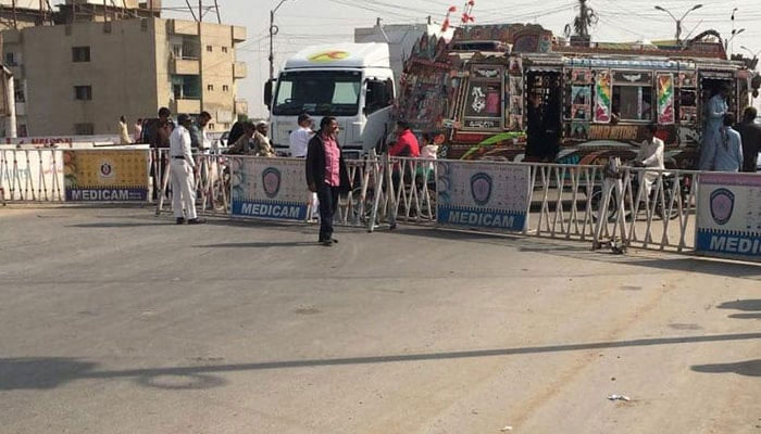 پی آئی ڈی سی چوک سے ایم ٹی خان روڈ جانے والے پل کو کنٹینر لگا کر بند کر دیا گیا ہے، جبکہ ایم ٹی خان روڈ پر سلطان آباد کے مقام پر بھی رکاوٹیں کھڑی کر دی گئی ہیں، اسی طرح میری ویدر ٹاور سے مولوی تمیز الدین روڈ کو بھی بند کر دیا گیا ہے۔
