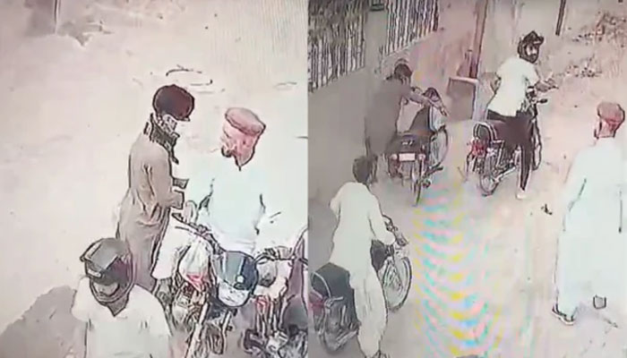 فوٹیج کے مطابق دو موٹرسائیکلوں پر سوار تین مسلح ڈاکوؤں نے سڑک پر جاتے ہوئے موٹرسائیکل سوار شہری کو روکا اور اسلحے کے زور پر لوٹ لیا۔