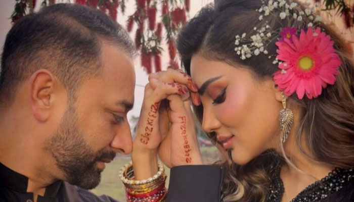 انہوں نے پھولوں سے سجا ہوا ہیڈ پیس اور ہلکی جیولری پہن رکھی تھی، جبکہ ان کے شوہر نے سفید پھولوں سے سجا انداز اپنایا، دونوں نے اپنے ہاتھوں پر مہندی سے ایک دوسرے کے نام بھی لکھوائے۔