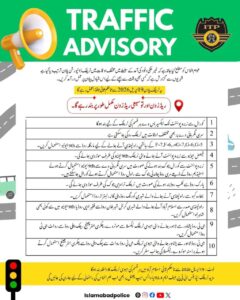 شہریوں کو ہدایت کی گئی ہے کہ وہ تازہ ترین ٹریفک اپڈیٹس کے لیے ایف ایم 92.4 اور اسلام آباد ٹریفک پولیس کے واٹس ایپ چینل سے رابطے میں رہیں۔