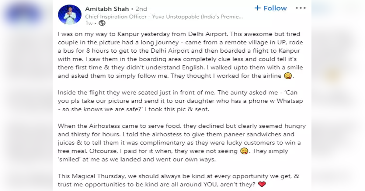 یہ کہنا ہے امیتابھ شاہ کا جو بھارت میں یووا ان اسٹاپ ایبل کے نام سے این جی او چلا رہے ہیں۔ امیتابھ نے لنکڈ ان پر اپنے دہلی سے کانپور جانے کے سفر کی داستان سناتے ہوئے لکھا کہ جب وہ جہاز میں بیٹھے تو انھیں بزرگ میاں بیوی کا ایسا جوڑا ملا جو یقیناً پہلی بار جہاز میں سفر کررہا تھا کیوں کہ ان دونوں کو ہی کچھ سمجھ نہیں آرہا تھا۔
